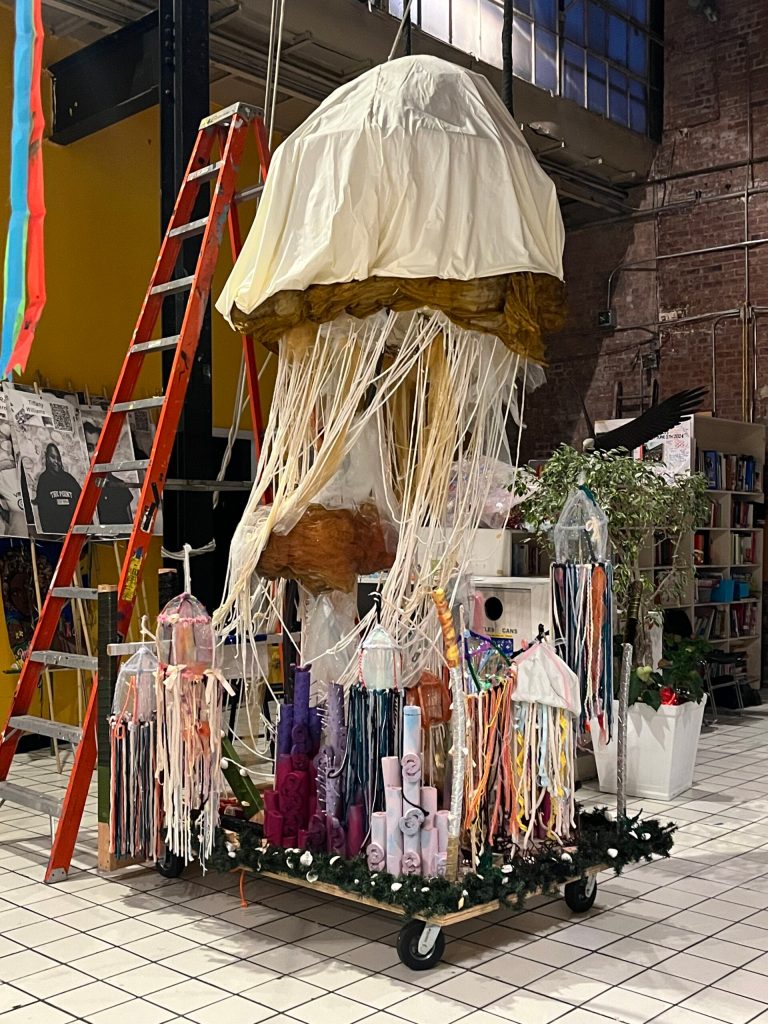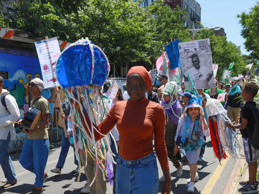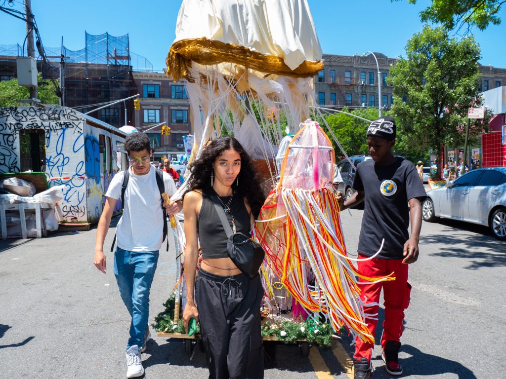 Students from BEAM Center and Bronx International High School march with a jellyfish float in the 2024 Fish Parade.