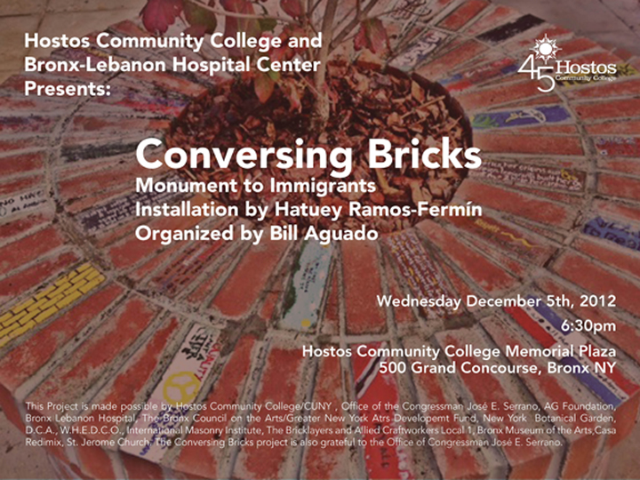This project is made possible by Hostos Community College C.U.N.Y., Office of the Congressman José E. Serrano, A.G. Foundation, Bronx Lebanon Hospital, The Bronx Council on the Arts /D.C.A. Greater New York Arts Development Fund, New York Botanical Garden, International Masonry Institute, Bricklayers and Allied Craftworkers Local 1 NY, Bronx Museum of the Arts, W.H.E.D.C.O., Casa Redimix, St. Jerome Church.