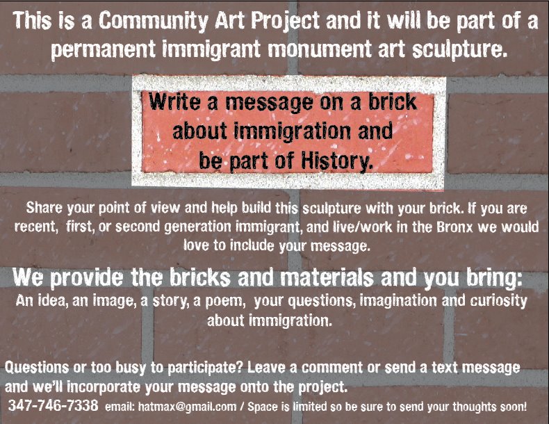 The project repurposed the original anti-immigrant bricks. A series of workshops, social media, email, and cell phone texting campaign was held and immigrants were asked to send and include their own messages onto the same bricks; and with them build a small wall and a round table with a bench. The intention is to transform messages of hate into a site for dialogue around issues of citizenship, immigration, and human rights.