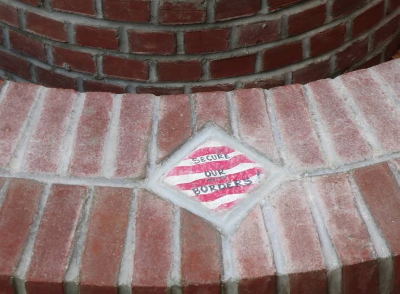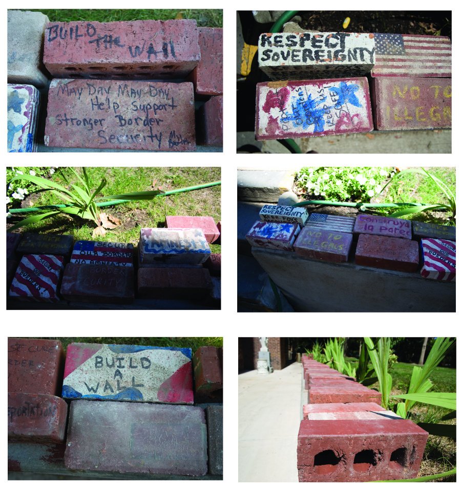 The Conversing Bricks (2012) public art project emerged from a campaign waged by anti-immigrant groups back in 2006 that sent thousands of bricks to members of Congress who opposed the construction of a border wall between Mexico and the United States and were in favored of comprehensive immigration reform. The bricks contained messages like, “Build a Wall,” “No to Illegals,” and “Secure our Borders.” Of the thousands of bricks sent to Capitol Hill, 273 were incorporated into this project.