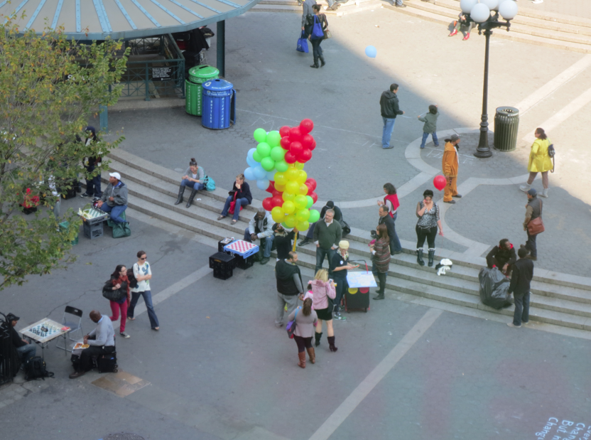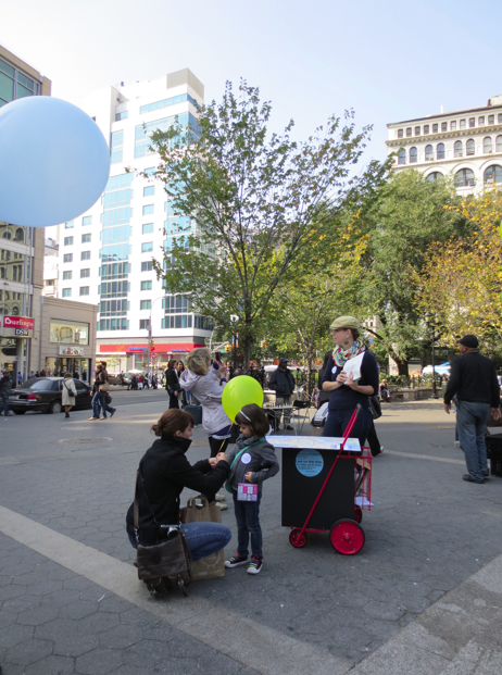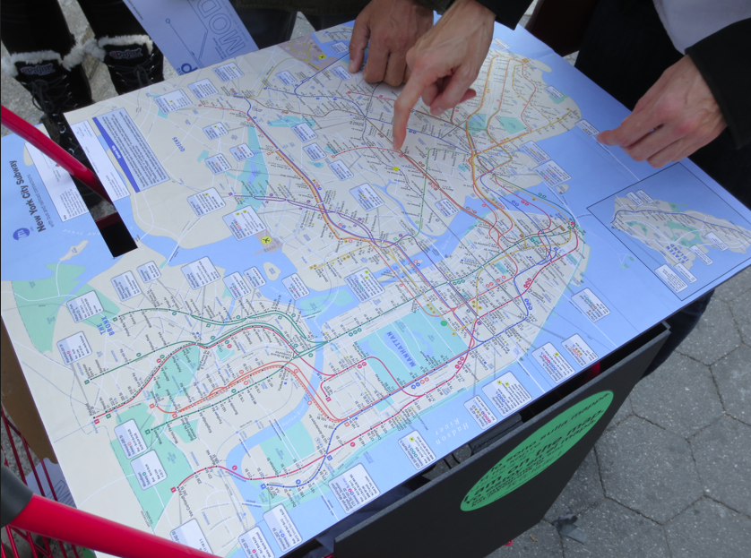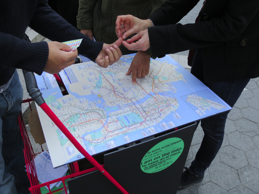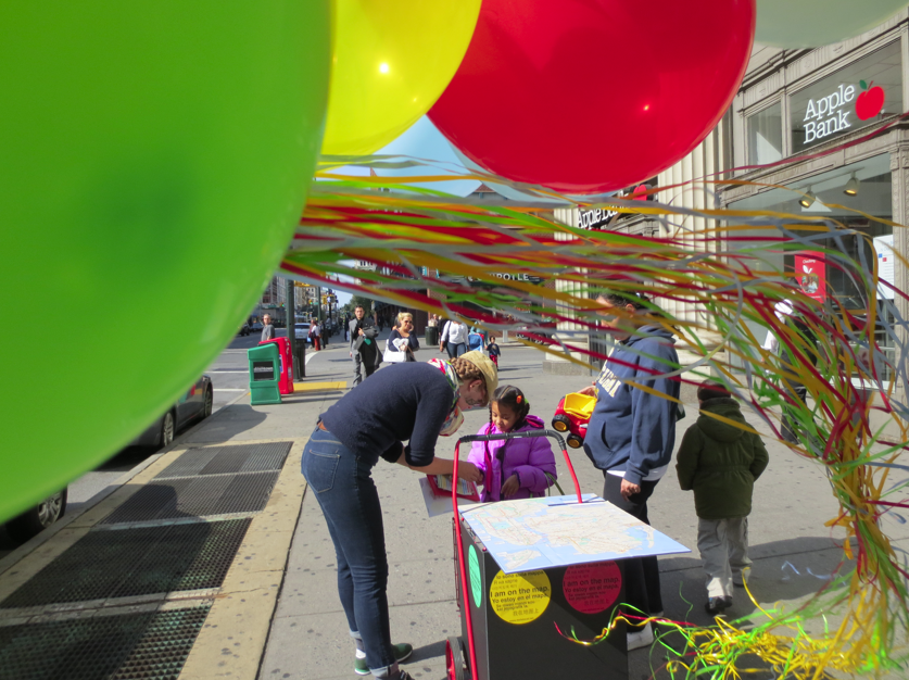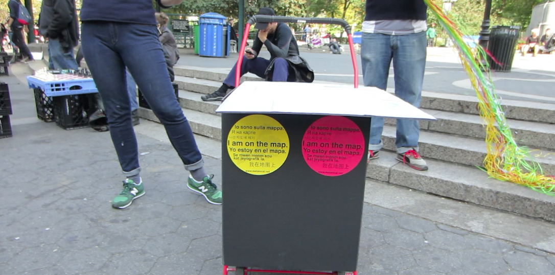 This multi-day participatory urban intervention visits plazas and other public gathering places throughout the city. The cart unfolds to serve as a base for a community map and visitors to the plaza are invited to pin locations in a city that are important to them. Participants are given a balloon corresponding to the color of the pin, printed with the text, “I am on the map” As they move through the plaza with their balloons, participants effectively turn the plaza itself into a map representing all of the places important to its’ inhabitants.