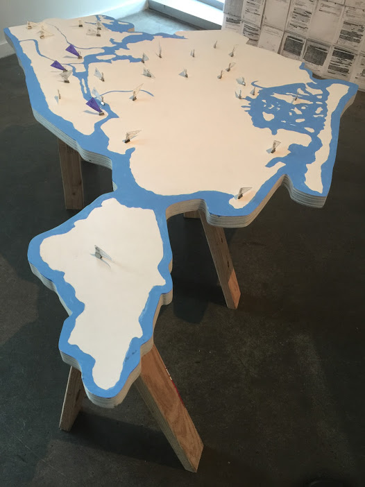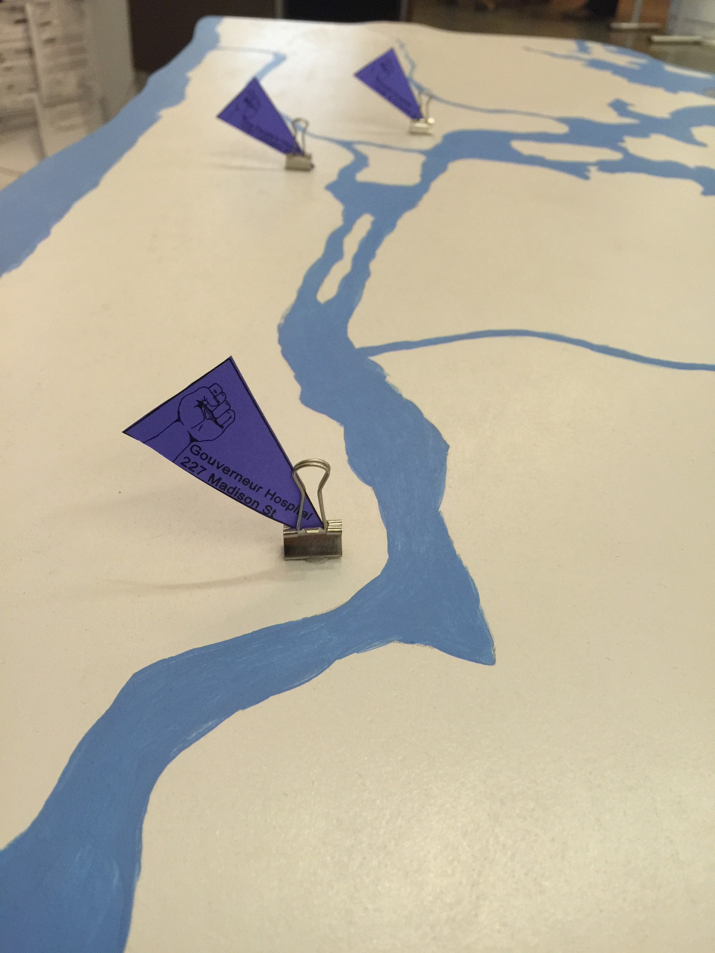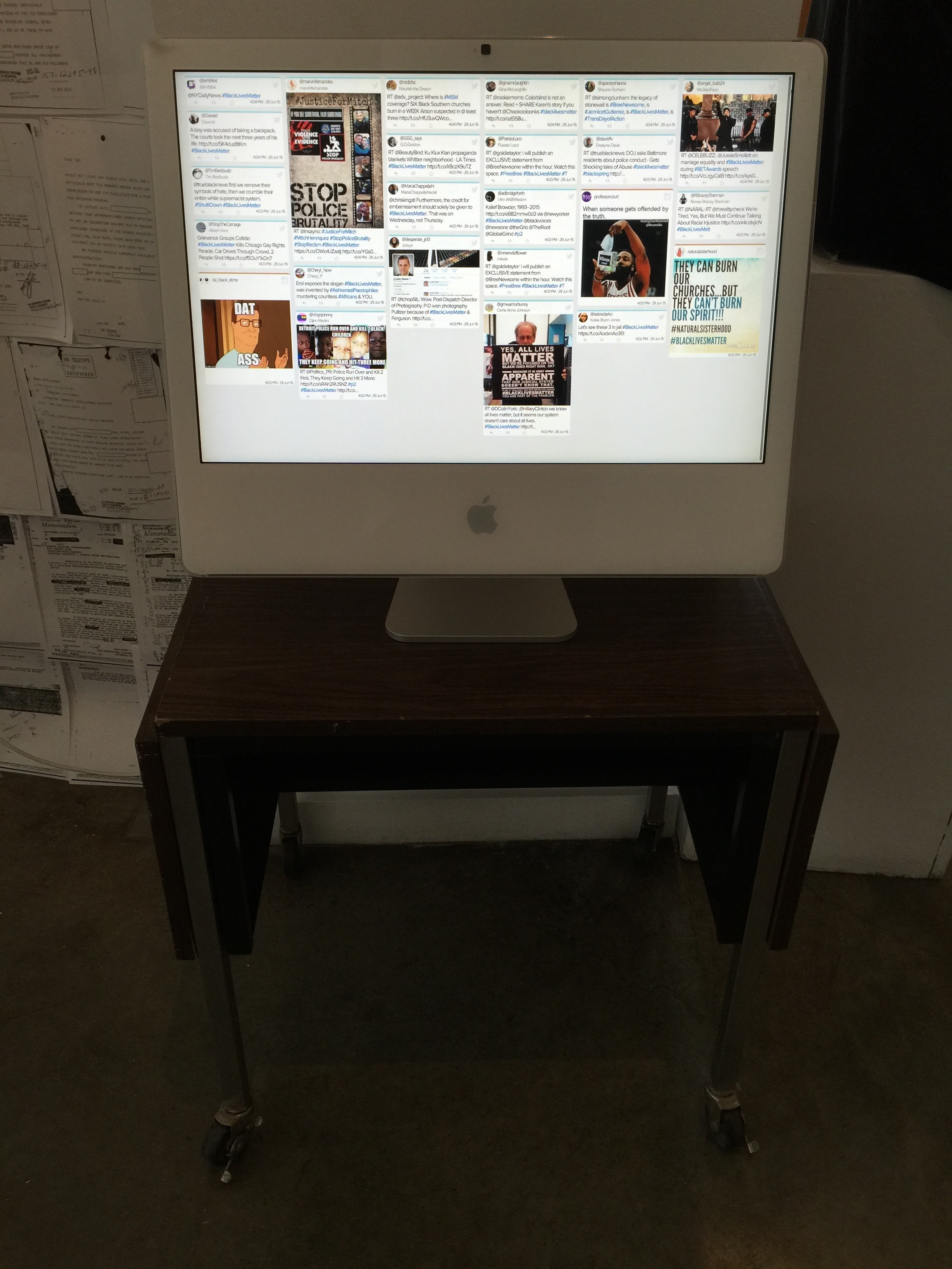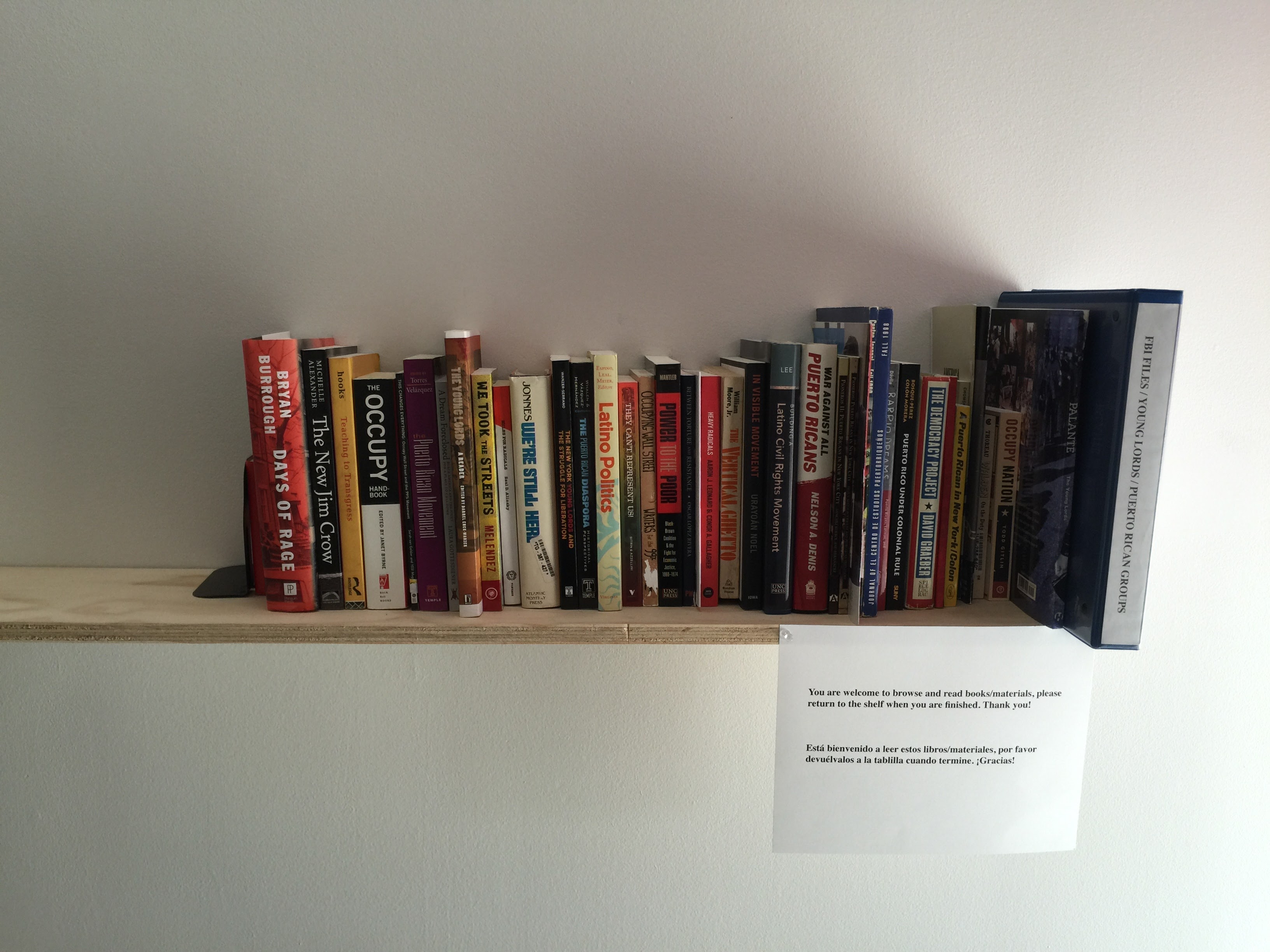 The “office” connects past and present with photos by Michael Abramson and Fred W. McDarrah from the Young Lords original office and new banners with Young Lords’ symbols. In the installation there are books about contemporary and past movements such as Occupy Wall Street and the Young Lords. The “office” includes a computer displaying a social media hashtag aggregator to contemporary issues such as #blacklivesmatter and a radio playing live WBAI programing in the background. In addition, the “office” includes a table map of New York City where visitors can map sites of struggle and FBI files on the Young Lords and Puerto Rican independence movements.