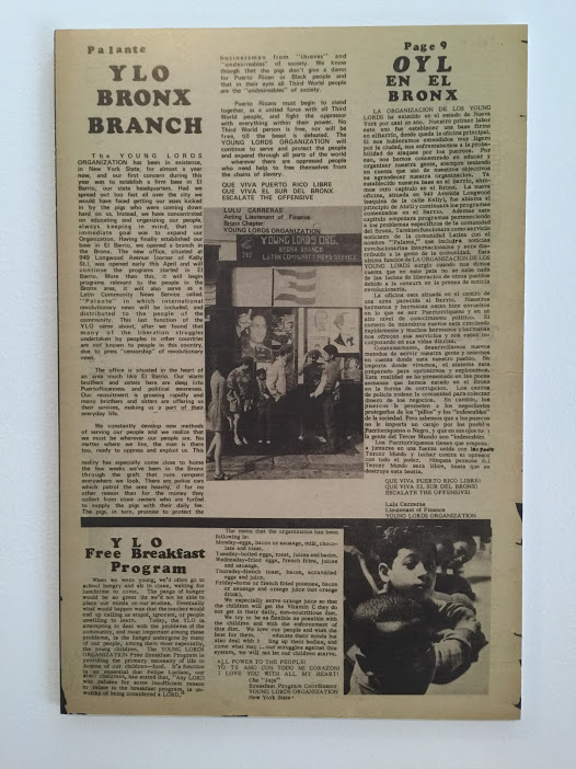 This project is part of ¡Presente! The Young Lords in New York, organized by curators Johanna Fernández and Yasmín Ramírez, the first museum survey to examine the radical social group founded by Puerto Rican youth in New York and Chicago in the 1960s. The exhibition examines the thematic, aesthetic, ideological, and historical parallels between the activities of The Young Lords and contemporary artists to demonstrate the organization’s resonance within American art. Presented at the Bronx Museum of the Arts in collaboration with El Museo del Barrio and Loisaida Center.