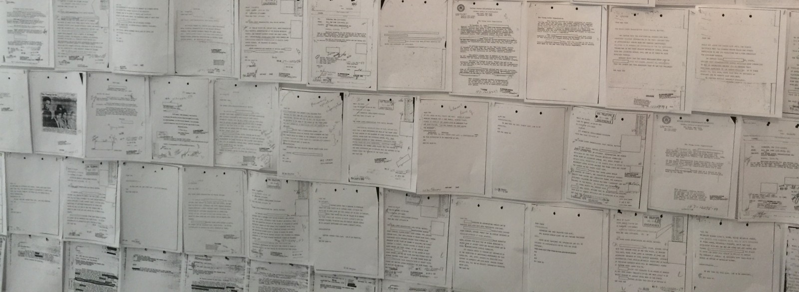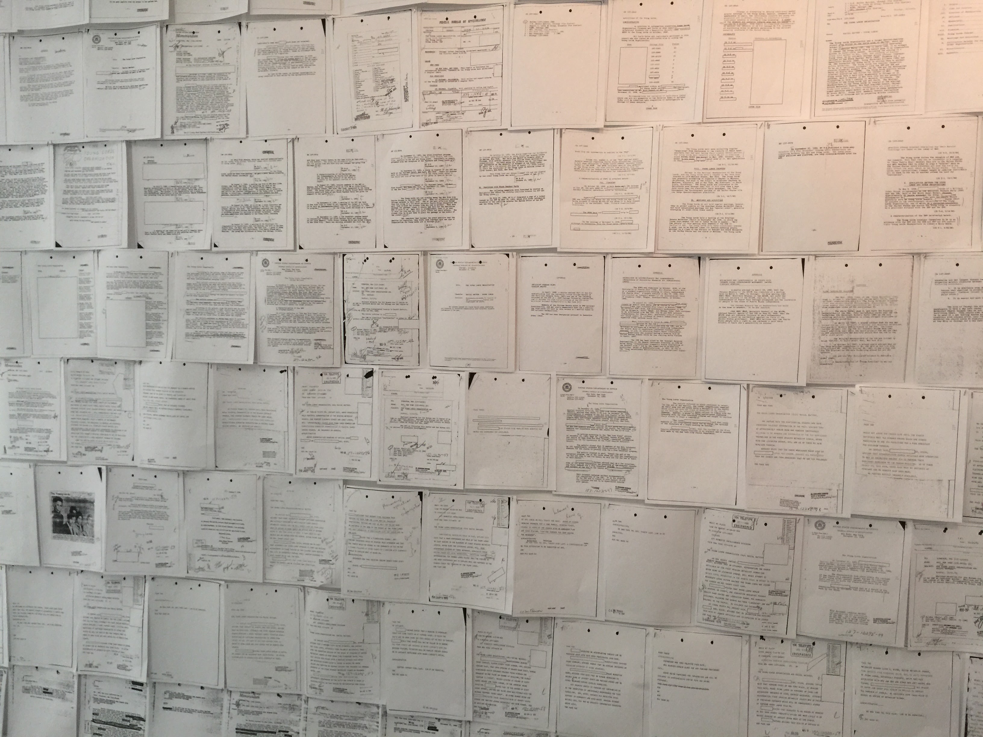 The documents on the wall are surveillance records of the Young Lords written by undercover agents hired by the FBI’s Counterintelligence Program (COINTELPRO). These agent provocateurs joined the Young Lords, and other protest organizations, to collect information for the FBI and destroy the group by provoking dissension and violence in its ranks.