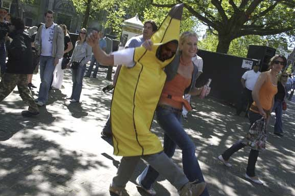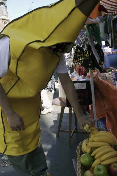 This project consists of a creation of a fictional character, Benito Banana, that appears and communicates as a web blog and in the city streets interacting with people and places. He is the personification of a satirical migrant character that reflects on migration. The phrase “A banana from my country can travel easier than me.” is the statement used as the foundation of these performances.The use of humor/irony is an important element in order to address the investigation of these themes.
